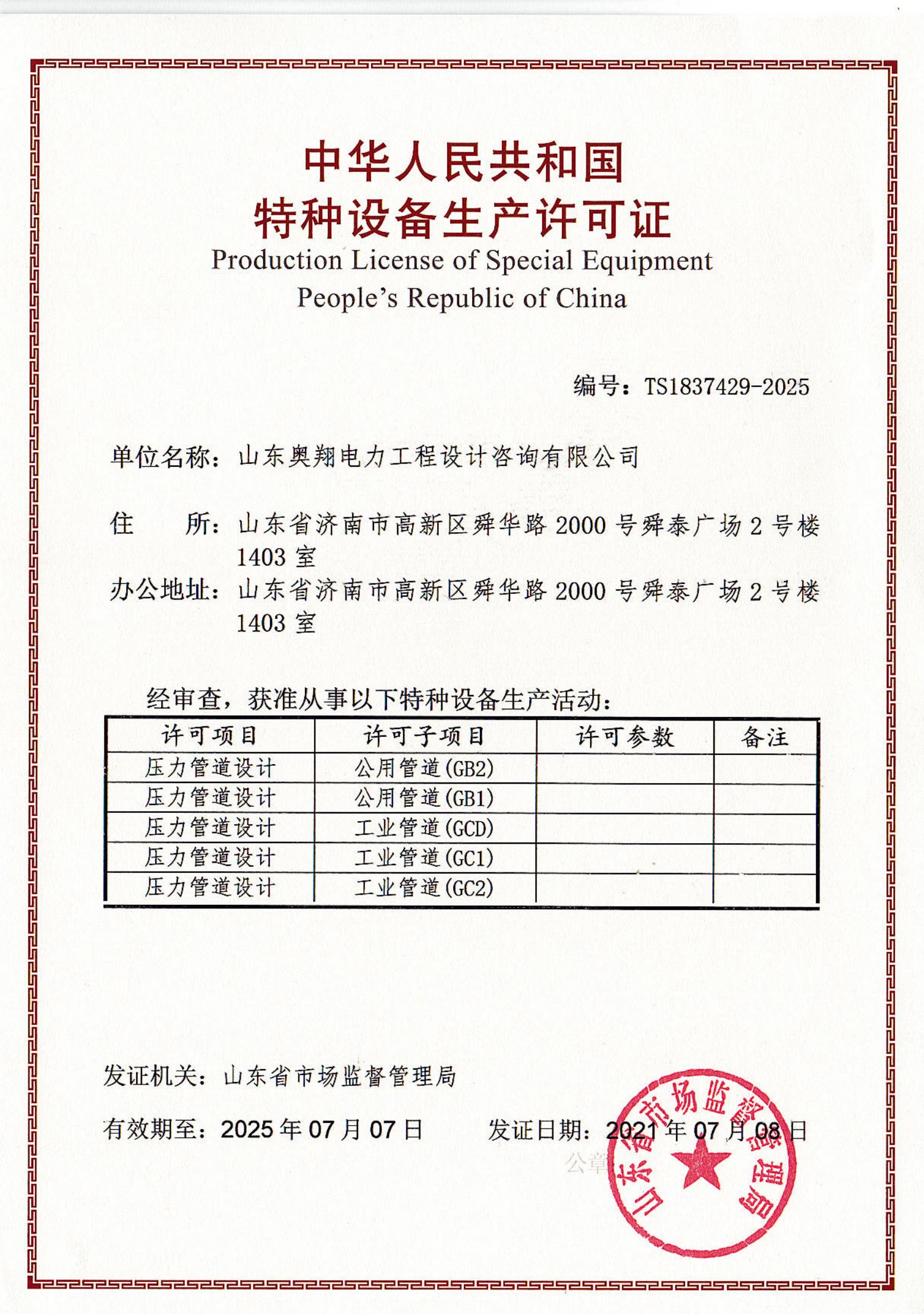 近日,在山東省市場(chǎng)監(jiān)督管理局最終審核后,山東奧翔完成了特種設(shè)備設(shè)計(jì)許可證書(shū)換證工作,實(shí)現(xiàn)了GB1,GB2,GC1,GC2,GCD級(jí)別壓力管道設(shè)計(jì)特種設(shè)備許可證的延續(xù)。